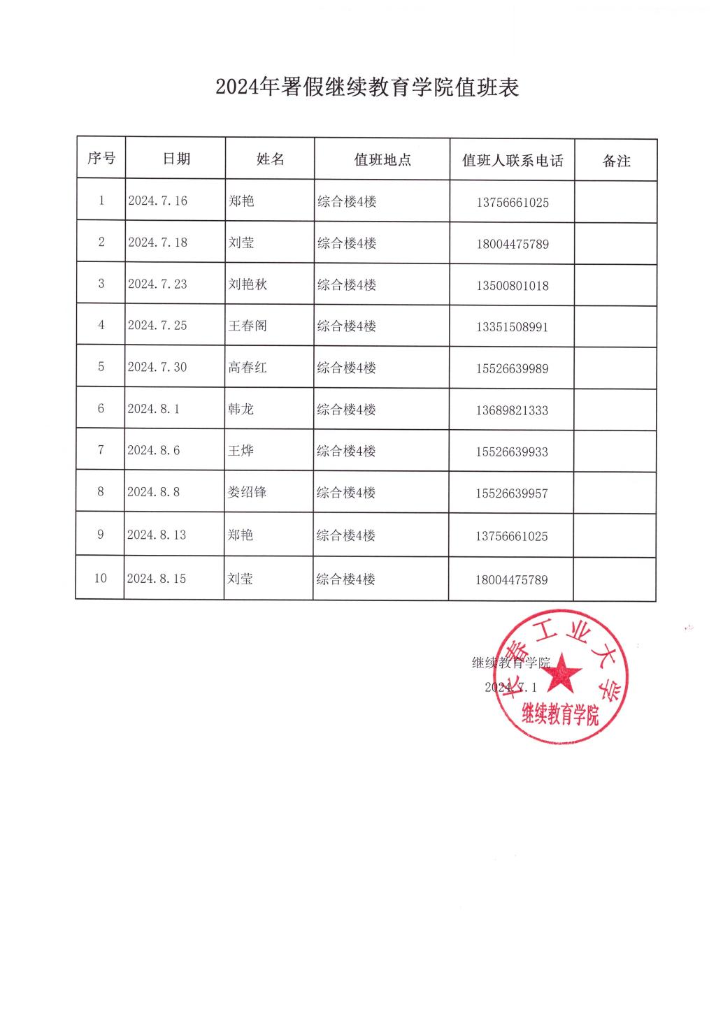 2024年暑假9428cn太阳集团值班表
